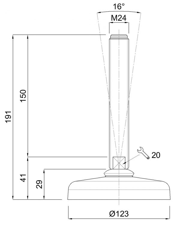 A műanyag talpba szerelt rozsdamentes, önbeálló menetes szárat egy villáskulcs segítségével könnyen el lehet forgatni és ezzel a géplábat pontosan pozícióba lehet állítani. A speciális higiénikus alátét nagyobb terhelhetőséget, a rozsdamentes acél borítás higiénikus megjelenést biztosít.