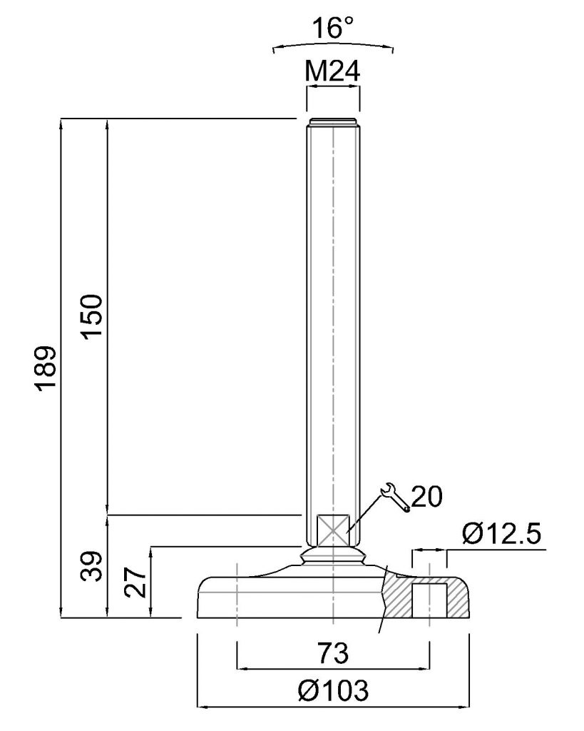 Szintező gépláb, alacsony profil, rozsdamentes menetes szár, önbeálló (16°)