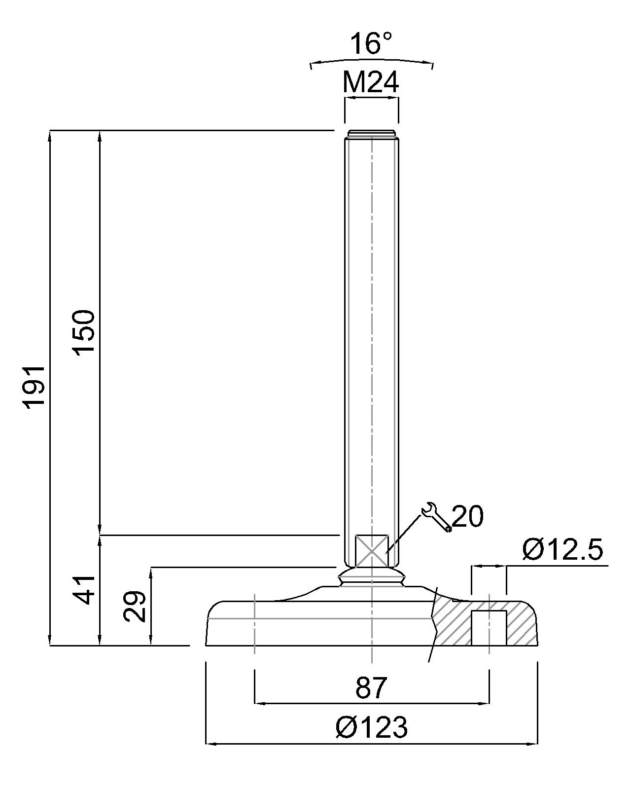 Szintező gépláb, alacsony profil, rozsdamentes menetes szár, önbeálló (16°)