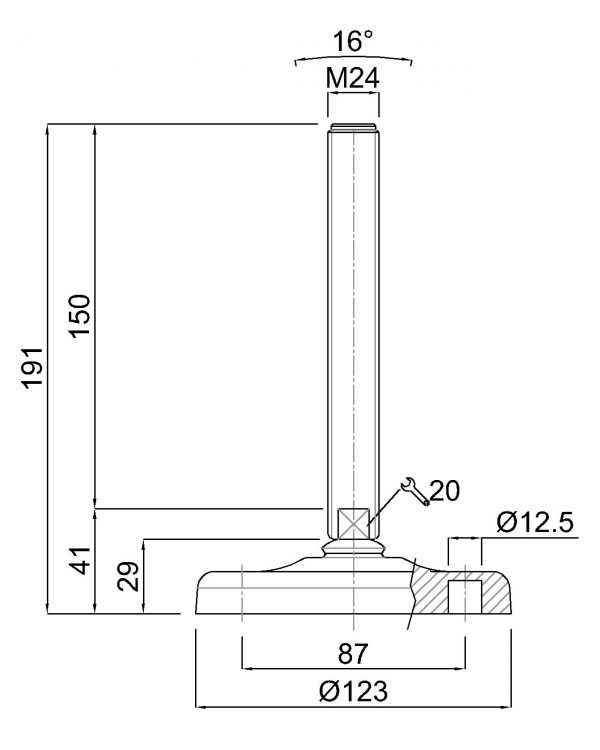 Szintező gépláb, alacsony profil, rozsdamentes finommenetes szár, önbeálló (16°)