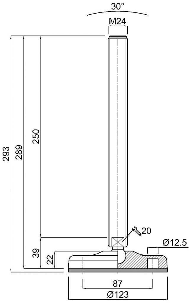 Állítható magasságú szintező gépláb üvegszállal erősített alacsony profilú műanyag talppal és rozsdamentes menetes szárral, 70 shore keménységű csúszásmentes NBR gumitalppal, csuklós (30°)