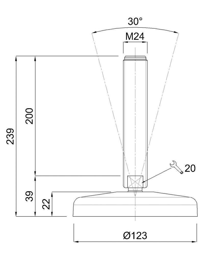 Állítható magasságú szintező gépláb üvegszállal erősített és rozsdamentes acéllemezzel borított alacsony profilú műanyag talppal és rozsdamentes, finommenetes szárral, csuklós (30°)