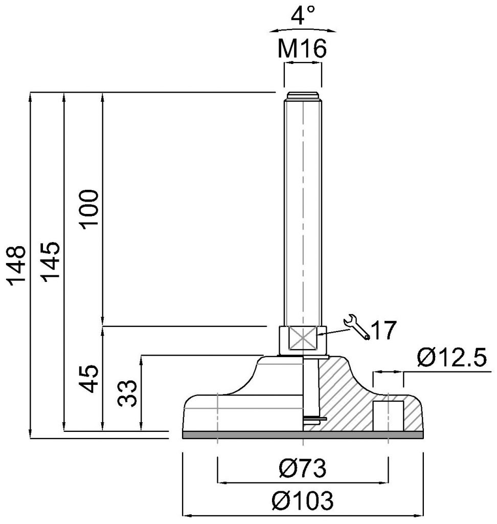 Műanyag talpas gépláb csúszásgátlóval, horganyzott acél menetes szár, fix, szögkiegyenlítés (4°)