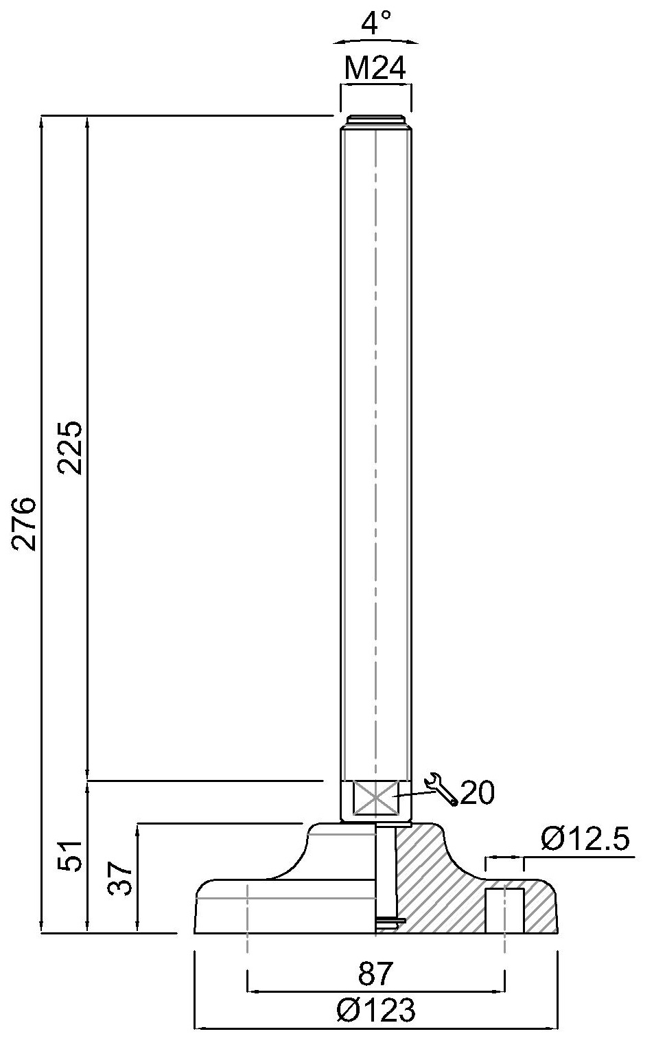Állítható magasságú gépláb üvegszállal erősített lefúrható műanyag talppal és horganyzott acél menetes szárral, szögkiegyenlítéssel (4°)
